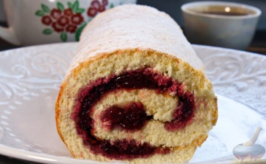 Ингредиенты: Яйца - 4 шт. Варенье вишнёвое (без косточек) - 280 г Мука - 160 г (1 стакан объёмом 250 мл) Сахар - 130 г Разрыхлитель - 1 ч. ложка Ванилин - щепотка Сахарная пудра - 1 ст. ложка Приготовление: 1.Подготавливаем все необходимые продукты.Муку просеиваем. Включаем духовку для разогрева до 180 градусов. 2.Яйца разбиваем в миску, добавляем сахар.Взбиваем миксером 7-10 минут, до пышной белой массы. 3.Муку смешиваем с разрыхлителем и ванилином и всыпаем в миску с яичной массой.Перемешиваем ложкой или лопаткой. 4.Противень застилаем пергаментом и выливаем туда тесто. Распределяем тесто по дну тонким слоем. Толщина слоя - примерно 1 см. 5.Выпекаем бисквитный корж в разогретой до 180 градусов духовке примерно 10 минут. Вынимаем сразу, как только бисквит слегка зарумянится. 6.Горячий бисквит отделяем от пергамента и сворачиваем в рулет. В таком виде оставляем остыть. 7.Затем рулет разворачиваем. Равномерно распределяем по поверхности коржа вишнёвое варенье.Опять сворачиваем рулет