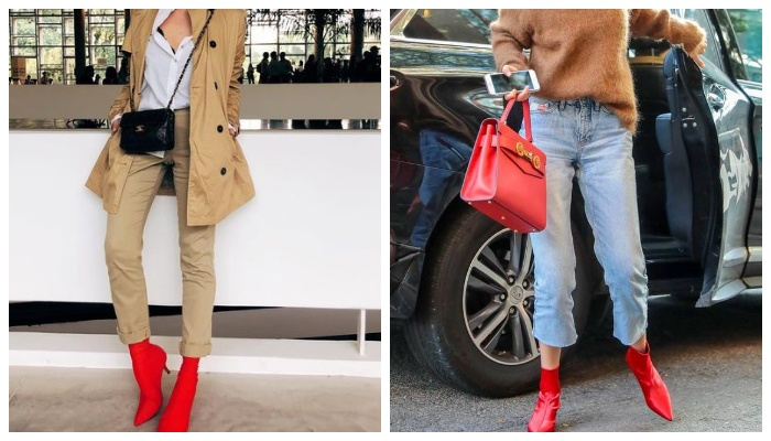 Красная обувь — деталь женского гардероба, которая у многих модниц вызывает кучу вопросов. В данной публикации мы собрали гармоничную подборку эффектных образов с красной обувью, на примере которой каждая из вас поймет, как и с чем лучше всего ее носить. Первый образ на каждый день стилисты составили с красными замшевым ботильонами на каблуке, дополнив их клетчатым блейзером, темно-серыми джинсами клеш, оверсайз футболкой с красными элементами, а также клатчем с леопардовыми акцентами. Еще один наглядный пример, как в повседневной жизни можно обыграть красную обувь. В данном случае, пестрые ботильоны гармонично перекликаются с черными скинни джинсами, черной минималистичной водолазкой, а также клетчатым подпоясанным жакетом. Темно-синий брючный костюм легкого оверсайз размера + белый принтованный лонгслив + красные замшевые ботильоны с громоздким каблуком — гармоничный look, в котором можно пойти даже на работу. Образ на миллион: полосатый брючный костюм + красные ботильоны + минимали