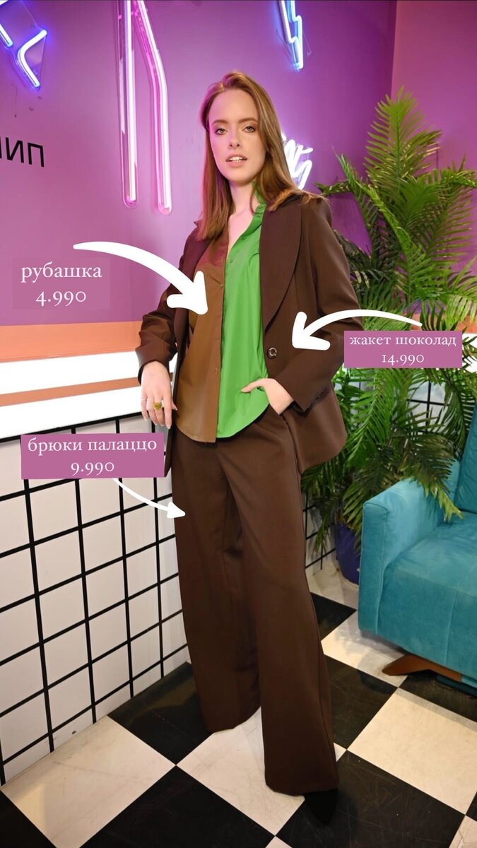 Раскрываем детали образа Марии: Стилист Марго подобрала для нашей героини целых 4 образа: повседневный, для корпоратива и новогодний. Образ #1 рубашка 4.990 жакет шоколад 14.990 брюки-палаццо шоколад 9.990 Образ #2 жакет укороченный 14.990 юбка мини с воланом 6.990 Образ #3 джемпер 4.449 юбка мини с пайетками 3.999 шуба 29.000 Образ #4 платье Dancing Queen 15.990 Представленные образы в наличии в IMB Fashion BAR.