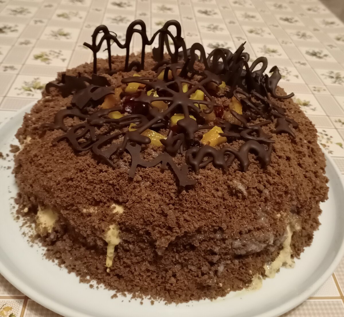 Новогодний супер тортик Продукты Для бисквита: Яйца - 6 шт. Сахар - 350 г Мука - 250 г Какао - 4 ст. л. Разрыхлитель - 1,5 ч. л. Масло растительное - для смазывания формы Для крема: Варёная сгущёнка - 430 мл Сметана - 350 г Для начинки: Вишня (замороженная) - 350 г Шоколад черный - 120 г Готовим шоколадный бисквит. Для этого отделяем белки от желтков. Взбиваем белки и постепенно добавляем сахар, взбивая в пышную массу. Вводим по одному желтку и при этом не прекращаем взбивать. В муку высыпаем разрыхлитель, просеиваем какао и хорошо перемешиваем. Высыпаем муку с какао к яичной массе и аккуратно перемешиваем сверху вниз лопаткой. Форму, в которой будем выпекать бисквит, застилаем пергаментной бумагой и хорошо смазываем дно и бока растительным маслом. Выливаем тесто в форму, хорошо его разравниваем и отправляем в духовку, разогретую до 180 градусов. Выпекаем шоколадный бисквит 35-40 минут. Готовый бисквит остужаем и разрезаем на три коржа. Приготовим крем для торта. Для этого размягченное
