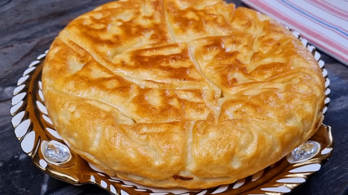 Пирог получается неимоверно вкусным, нежным и очень оригинальным. Ингредиенты: • Яйцо - 3шт • Соль - 0.5ч.л • Вода - 50мл • Мука - 350гр • Сливочное масло - 70мл • Растительное масло - 30мл • Сыр - 250гр В глубокую посуду разбиваем яйца, добавляем соль и воду. Тщательно перемешиваем венчиком. Всыпаем муку и замешиваем мягко тесто. Тесто оставляем отдыхать на 10 минут. Отдохнувшие тесто делим на две части. Далее половину теста делим ещё на 12 частей. Формируем шарики, и каждый из них раскатываем в тонкий пласт. В кипящую воду добавляем немного соли и растительного масла. Каждый лист теста опускаем в воду и варим по 30 секунд. Затем окунаем в холодную воду чтобы остудить. В небольшой миске соединяем растительное масло и растопленное сливочное масло. Глубокую сковороду смазываем маслом и выкладываем первый слой теста. Тесто снова смазываем маслом и покрываем вторым слоем из теста. Последовательно, каждый слой смазываем маслом. Между 5 и 6 слоями выкладываем сыр. Накрываем крышкой и го