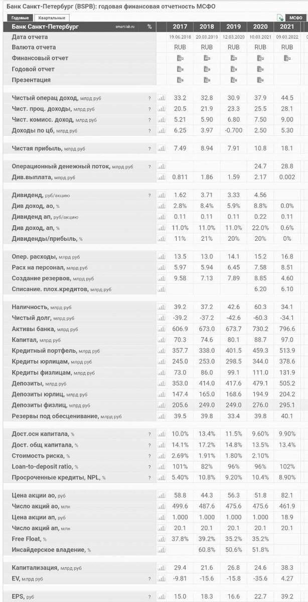Российский коммерческий банк, работающий в основном в северном регионе страны. 👉Банк активно развивается. Открывает представительства по всей России, стабильно наращивает капитал, выручку, чистую прибыль и, соответственно, дивиденды. Див. политика предполагает выплату всего 20% чистой прибыли на дивиденды, так как сейчас находится в стадии формирования капитала и наращивания кредитного портфеля. 👆Но даже эти 20% от прибыли дали доходность 11% за 1 полугодие 2022 года. 🥰БСПБ любит побаловать своих акционеров байбеками. За 5 лет было выкуплено почти 10% обыкновенных акций. Доля каждого акционера в бизнесе выросла на 10%. 👉26% акций владеет менеджмент. Вот и ответ на вопрос, с чего такая щедрость? Мотивация активно развивать банк и не обижать акционеров явно есть) Риски: 1) Акция низколиквидная, а значит переоценить её могут только дивиденды. Див. политика утверждена до 23 года. 2) В основном банк выдаёт кредиты юр. лицам (больше 70% кредитов), платёжеспособность которых нам неизвестн