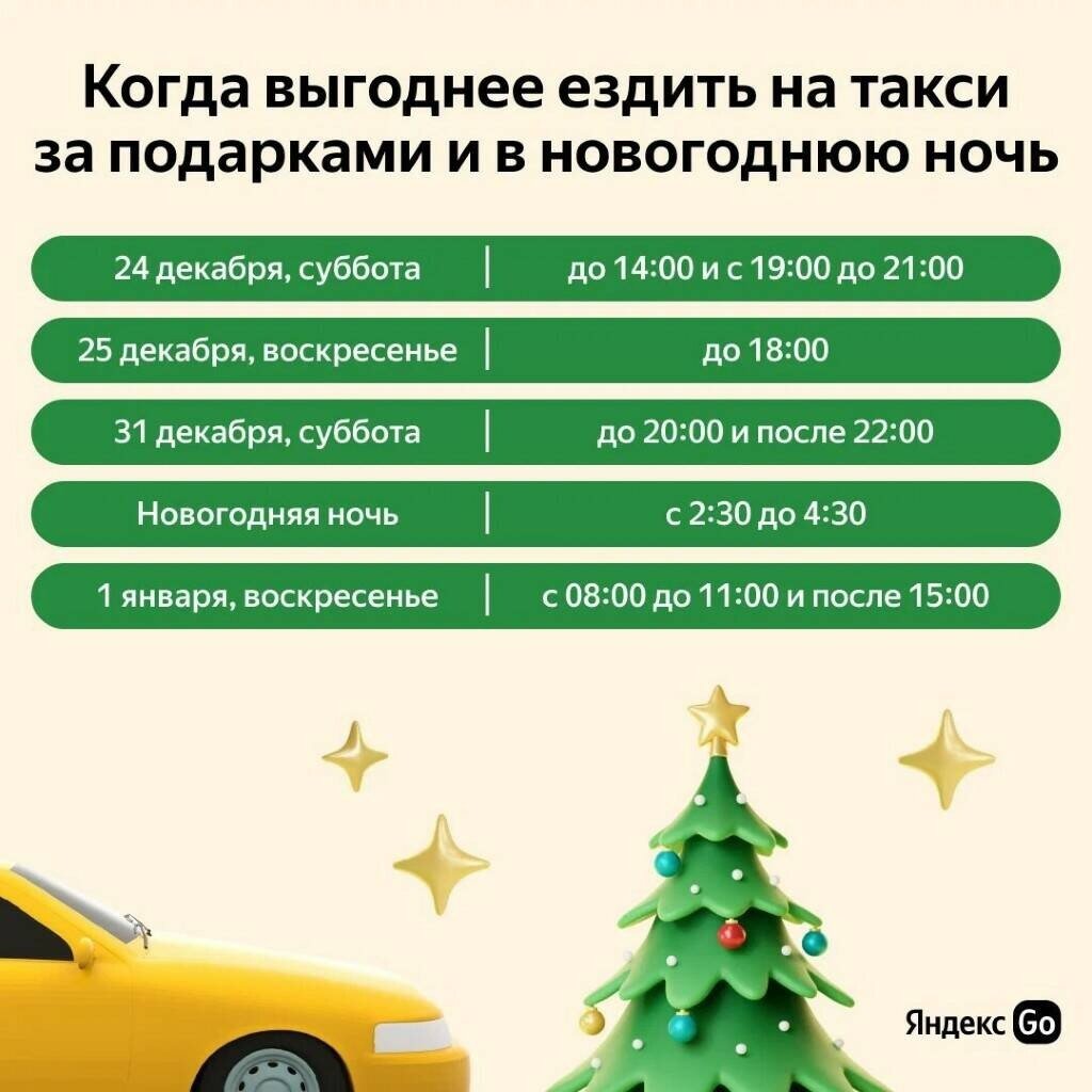 Публикуем наиболее выгодное время. Предпраздничный и новогодний ажиотаж скажется на стоимости поездок на такси. Вырастет спрос, за ним невольно вырастет и ценник. Когда же выгоднее всего пользоваться услугами перевозчика, рассказали аналитики сервиса «Яндекс Go». Наиболее удачное время: 24 декабря – до 14 часов и с 19 до 21 часа; 25 декабря – до 18 часов; 31 декабря – до 20 часов и после 22 часов; Новогодняя ночь – с 2:30 до 4:30; 1 января – с 8 до 11 часов и после 15 часов. Филипп Котов