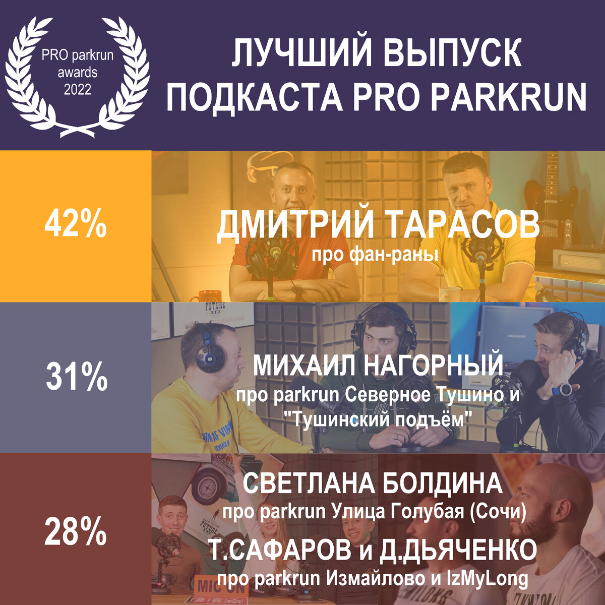 Продолжаем представлять номинации, подводящие итог 2022 года и следующая на очереди: "Лучший выпуск подкаста PRO parkrun". Эта номинация повторяет прошлогоднюю, но если в тот раз в ней было всего 4 претендента на это звание, то сейчас - 26. За 2022 год было записано 26 выпусков, в среднем по выпуску раз в две недели. Поэтому выбор у экспертов был очень тяжелый и большинство выбирали несколько вариантов! Итоги выглядят следующим образом: 1. Дмитрий Тарасов про фан-раны - 42% 2. Михаил Нагорный про parkrun Северное Тушино и "Тушинский подъём" - 31% 3. Третье место разделили между собой два выпуска, записанных в самом начале 2022 года: Светлана Болдина про parkrun Улица Голубая (Сочи) и Тимур Сафаров с Дмитрием Дьяченко про parkrun Измайлово и IzMyLong - по 28% И вот что по этому поводу говорят наши эксперты! Особый лайк за подкаст с детьми. Я не знаю, сколько часов ушло на съемки, но получилось очень классно! А еще интересно слушать, как разные сообщества (например, Беговое Сообщество)