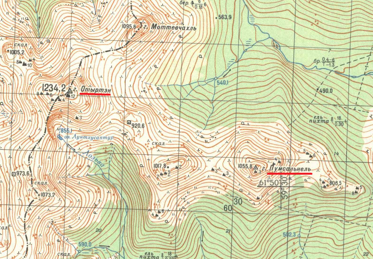 Но только эту группу высадили не на Отортене (Отыртэн – так обозначено на карте), а у горы Пумсальнель. Не в самых верховьях Лозьвы, не у озера Лунтхусаптур, а именно там. Посмотрите на карту и увидите разницу – где Отортен и где Пумсальнель.