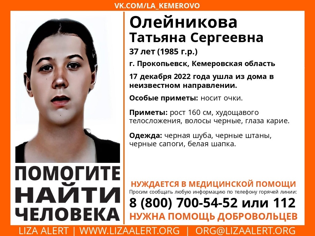 В Прокопьевске пропала 37-летняя женщина. Волонтёры поисково-спасательного отряда «Лиза Алерт» Кузбасс начали поиски. Татьяна Олейникова в субботу, 17 декабря, ушла из дома в неизвестном направлении. Её приметы: рост 160 см, худощавого телосложения, чёрные волосы, карие глаза, носит очки. Была одета в чёрную шубу, чёрные штаны, чёрные сапоги и белую шапку. Всех, кто знает что-либо о местонахождении пропавшей или готов оказать помощь в поисках, просят сообщить по телефону поисково-спасательного отряда «Лиза Алерт» (800) 700-54-52 или 112. Фото: ПСО «Лиза Алерт» Кузбасс