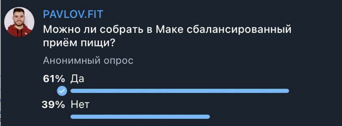 Сегодня поговорим о любимом МакДаке, ныне "вкусно и точка" в РФ =) Недавно у себя телеграм я задал вопрос: "можно ли собрать в Маке сбалансированный приём пищи?". Мнения очень разделились, что стало для меня приятной неожиданностью Какое же мое мнение? Оно следующее… Если рассматривать блюда в маке чисто с точки зрения КБЖУ, то ответ будет однозначно "да", ведь к каждому блюду можно легко найти описание и состав Например, позиция «цезарь роль с курицей». Давай разберем это блюдо по «правилу тарелки» (наверняка знаешь о нем) Лаваш — углевод, филе курицы в панировке — белок и жиры, овощи — клетчатка С точки зрения этого правила всё присутствует и на стандартную порцию приходиться следующее КБЖУ - 472/19/22/48 Если с «правилом тарелки» все ОК, то в БЖУ НЕ совсем баланс, т.к. в соотношении жиров явно больше чем белка Что делаем? Просим НЕ добавлять соус, что автоматом снижает кол-во жиров, а значит и калорийность блюда. На выходе получаем КБЖУ на порцию 300/18/10/30 За счёт отказа от соуса