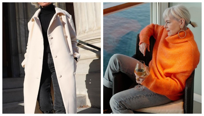 Сегодня мы с вами будем обсуждать, как правильно составлять образы для женщин в возрасте, чтобы выглядеть максимально молодо и привлекательно. Оставайтесь с нами, только здесь вы узнаете много полезных нюансов, благодаря которым, вам будет удаваться выглядеть моложе своего возраста благодаря правильно собранным аутфитам. Первый совет от стилиста: не обходите стороной яркие вещи. Перед вами повседневный look, который за счет яркого свитера с высокой горловиной молодит и освежает визуально женский облик. Теплый и практичный набор вещей, идеально подходящий для зимнего времени года: шуба Тедди бежевого цвета + скинни синие джинсы с высокой талией + высокие замшевые сапоги в ковбойском стиле на деревянном каблуке + черный минималистичный лонгслив. Такой простой в исполнении, но в тоже время очень эффектный вариант образа для красоток постарше. Шикарный "омолаживающий" образ включает в себя бежевые брюки классического фасона, укороченное пальто универсального цвета с меховым воротником, ярк