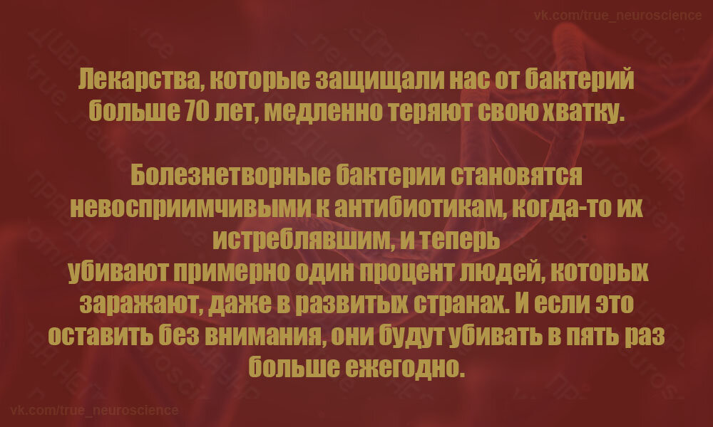 Те лекарства, что защищали людей от бактерий более 70 лет, постепенно "теряют хватку". Болезнетворные микроорганизмы становятся невосприимчивыми к антибиотикам, которые ранее помогали их истреблять. Теперь бактерии убивают около 1% заражённых ими людей (причём даже в развитых странах). Если данное обстоятельство оставить без внимания, они будут убивать в 5 раз больше каждый год. Источник: статья "Как учёные готовятся к миру без антибиотиков?" на Hi-News.ru.