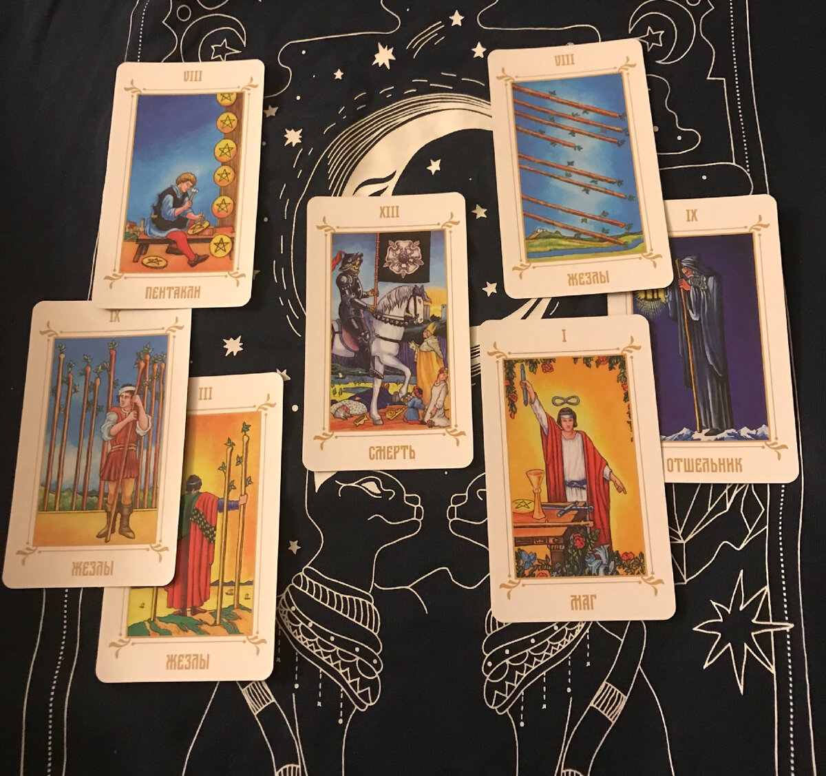 Уважаемые читатели, всем доброго времени суток! То, что происходит сейчас, это уже есть и не изменить, но можно заглянуть, что же нас ожидает в паре? Что к этому приведёт? расклад на отношения! Смотрим расклад с лева на право. левая сторона, что сейчас? -Восьмерка пентаклей говорит, о чем-то новом. В нашем раскладе это скорее всего, начало новых отношений, или вы перешли на новую ступень в отношениях, более серьезный шаг. Может стали жить вместе, строить совместные планы на будущее. -Далее девятка жезлов, указывает на страх повторения прошлых ошибок, жизненных ситуаций. Скорее всего, в прошлом, у вас или у вашего партнера, были не удачные отношения, вас предал любимый человек. Ситуация ещё не совсем забыта, рана не зажила и страх чего то нового ещё присутствует. Вы боитесь поверить и довериться своему партнеру. -тройка жезлов указывает, что даже при присутствующем сомнении и страхе после обид и разочарований в прошлом, в вашей паре есть взаимопомощь, понимание партнера, поддержка и