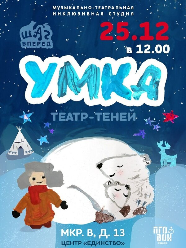 Инклюзивная музыкально-театральная студия «Шаг вперед» 25 декабря покажет первый спектакль. Юные артисты представят зрителям зимнюю сказку «Умка». «Шаг вперед» открылся по просьбе родителей детей с ограниченными возможностями. Студия стала еще одним направлением работы Пущинского городского отделения всероссийского общества инвалидов. В студии с детьми работают музыкальный терапевт и клинический психолог, художественный руководитель, педагог театрально-двигательных постановок и художник декоративно-прикладной живописи. Детей учат общаться, понимать эмоции и управлять своим телом, преодолевать волнения. В студии занимаются не только театром, но и рисуют, играют на музыкальных инструментах. 25 декабря можно будет также увидеть выставку работ художественной мастерской, двигательные и театральные постановки и небольшие концертные номера. Показ состоится в 12:00 по адресу: Пущино, микрорайон В, дом 13. Источник: Администрация городского округа Пущино