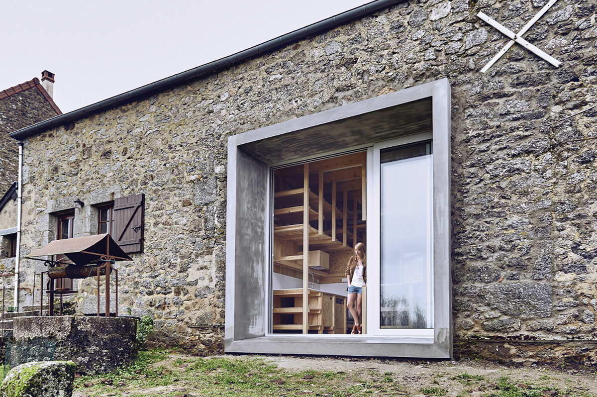 Древний каменный амбар в национальном парке Морван был реконструирован и превращён в уникальную летнюю резиденцию. Здание в целом сохранило свой сельский облик, а новая ниша из бетона и стекла добавила ему контраста и современности. Большая кухня в центре стала главной изюминкой проекта. Деревянная мебель в ней полностью авторская, множество шкафов и полок предназначено для хранения местных культурных артефактов. Спальная зона находится на мансарде. Посмотрите также проектную графику. Название: Загородный дом (Maison de campagne)