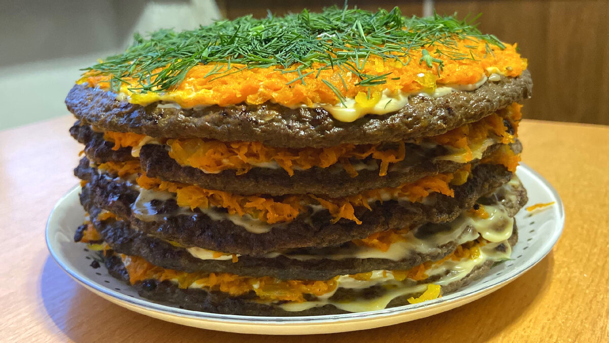 Печеночный торт с морковью и луком