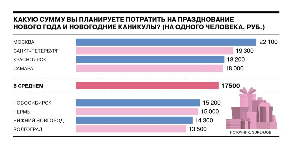 Города-лидеры по расходам – Москва и Санкт-Петербург. В 2022 году россияне планируют потратить на праздники меньше, чем в 2020 году и 2021 году (18,3 тыс рублей и 18,5 тыс рублей соответственно). Города-лидеры по расходам – Москва и Санкт-Петербург, наиболее скромные траты планируют жители Волгограда, сообщает сервис SuperJob. По данным опроса среди жителей городов-миллионников, каждый третий россиянин (32%) планирует бюджет на празднование Нового года и новогодние каникулы, а каждый второй (51%) этого не делает. Ранее Readovka сообщала, сколько будет стоить развлекательная программа для детей.