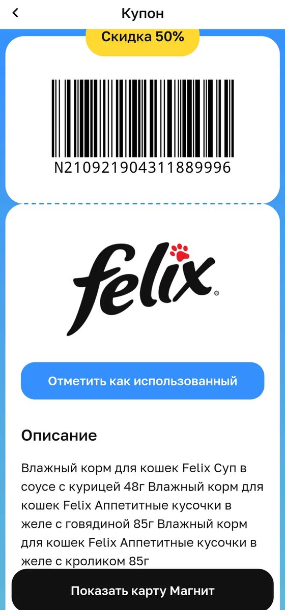 В приложении магнита получил скидку. Котов у меня нет. Может пригодится кому-то.