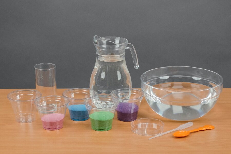 10. Возьми миску с водой и начни засыпать в неё гидрофобный песок разного цвета.