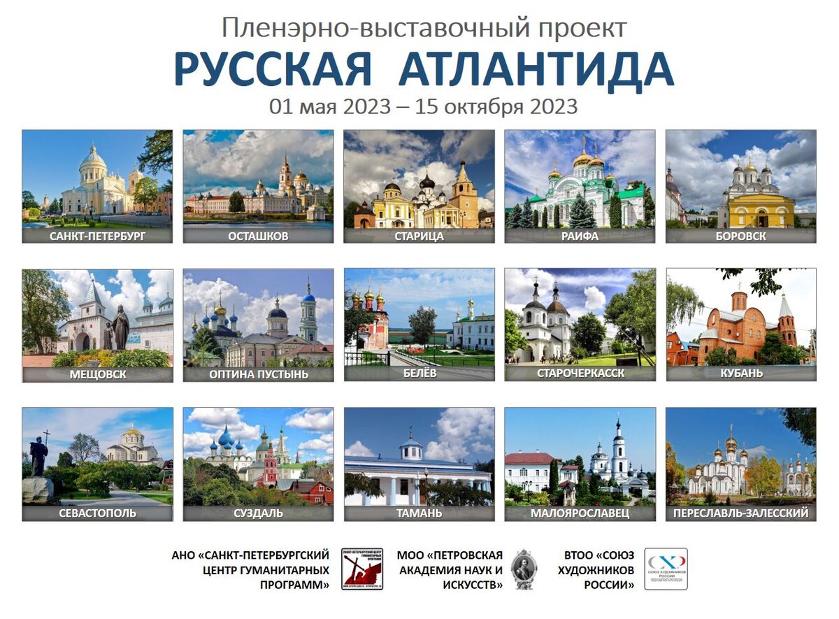 На 2023 год пленэрной базой станут 15 городов: Санкт-Петербург, Осташков, Старица, Раифа, Боровск, Мещовск, Оптина Пустынь, Белёв, Старочеркасск, Кубань, Севастополь, Суздаль, Тамань, Малоярославец, Переславль-Залесский.