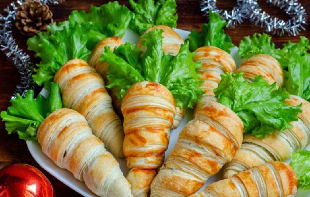 Оригинальные слоёные трубочки "Морковки" с салатной начинкой точно не останутся незамеченными на праздничном столе. Румяное хрустящее слоёное тесто идеально дополнено сочной начинкой из копчёного куриного мяса, помидоров, огурцов, сыра и отварных яиц. Моркови в составе этой закуски нет, используется только морковный сок, смешанный с томатной пастой, для смазывания теста перед выпеканием. Подготавливаем продукты.