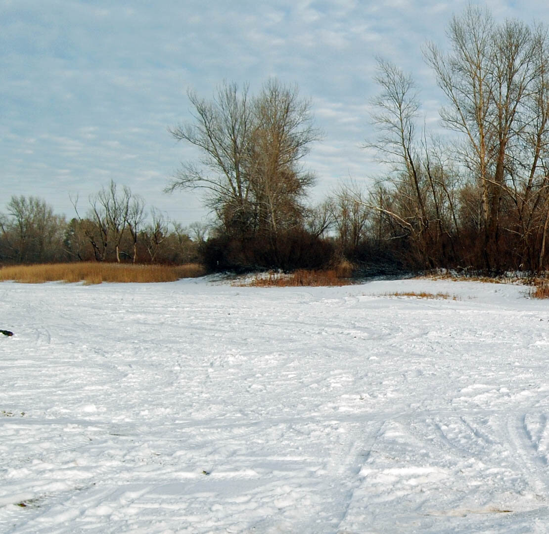 Я тогда переходил озеро напрямую вот по этому льду, покрытому слоем снега. Тут и следы машин, и лыжные колеи