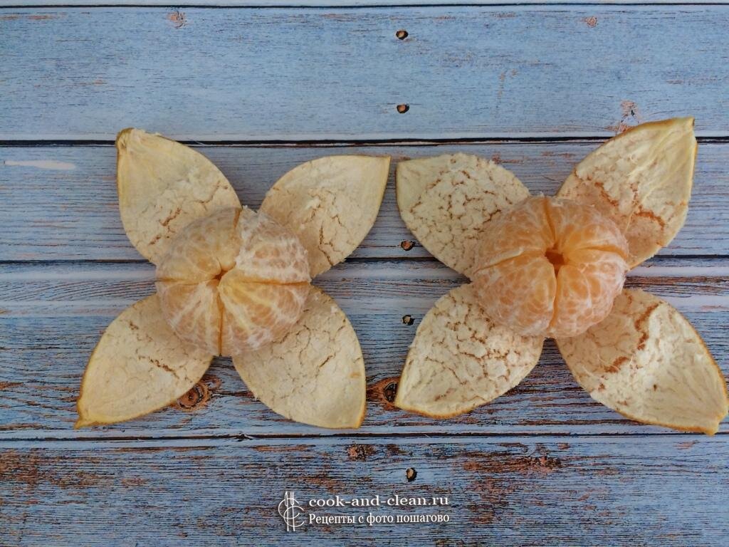 Давайте сегодня приготовим этот вкусный, ароматный и по — зимнему уютный мандариновый чай. Напиток согреет вас после зимней прогулки, успокоит после долгой физической активности. И просто создаст уютное настроение после долгого трудового дня. Готовится мандариновый чай очень просто. Нужно, правда, немного к нему подготовиться. Например, высушить корочки от мандарин. Но, поверьте, результат того стоит. Мандариновый сок не выбрасываем, его тоже отправим в чай. Вкусные специи придадут мандариновому чаю неповторимые нотки, которые и сделают наш напиток просто великолепным. Мандарины очищаем от кожуры. Кожуру мандарина необходимо высушить любым удобным способом: можно оставить на сутки на столе, высушить на горячей батарее или в духовке. Я сушила в духовке. Разрываем кожуру на мелкие кусочки, выкладываем на противень, застеленный пергаментом и ставим на верхний уровень духовки на 30 минут при температуре 140 градусов, режим верх+конвенция. Из мякоти мандаринов делаем пюре с помощью блендера