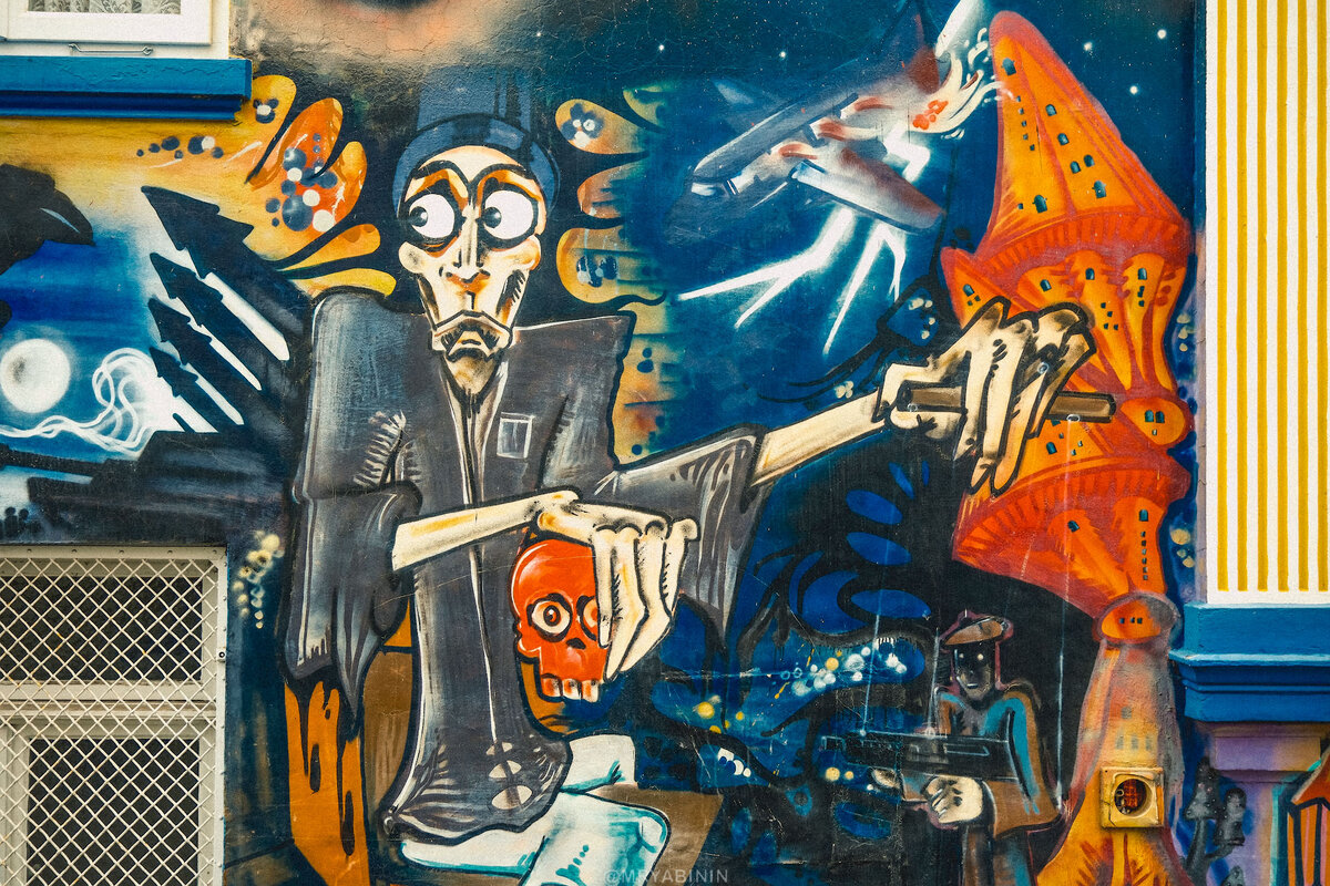 Сначала граффити кажутся не просто повсеместными, а не имеющими никакой структуры, но потом начинаешь находить закономерности и связи с происходящим в городе. Например, тут проходит кинофестиваль, и некоторые граффити четко из мира кино...