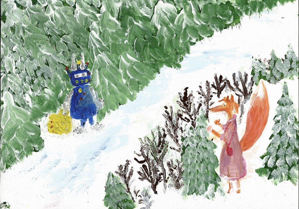 И тут из леса, присвистывая и размахивая пакетом с угощениями, вышел заяц. Волк, увидев живого робота, от удивления разинул пасть, Дед Мороз улыбнулся, он сразу понял, в чём дело.