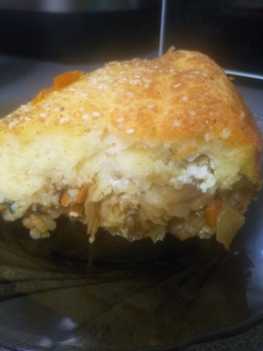 Вкуснейший и простой в приготовлении пирог. Без больших затрат! Ингридиенты: Для теста: 3 яйца; 250 гр. сметаны; 250 гр. майонеза; 1 ч.ложка соды; 8 ст.ложек муки Для начинки: Капуста - 400-600 гр.; Лук - 1 шт; Морковь - 1 шт. Рис - 150-200 гр.; Томатная паста - 2 со.ложки; Соль, перец - по вкусу; Раст. масло - 4-5 ст.ложек; Специи Зелень Приступим с приготовления начинки. Лук порезать средним кубиком и обжарить на растительном масле до золотистого цвета. Морковь очистить и натереть на крупной тёрке . Добавить к луку. Обжарить до мягкости. Капусту порезать небольшими квадратиками Так удобнее есть, в отличие от соломки, и выглядит эстетичнее. Обжарить на сковороде в небольшом количестве растительного масла . Крышкой не закрывать иначе она выделит много влаги и получится вареной, а не жаренной. Минут через 10 добавить к капусте обжаренные лук с морковью. Посолить, поперчить по вкусу, добавить специи. У меня это базилик, куркума и паприка. Добавить две ложки томатной пасты. Все пер