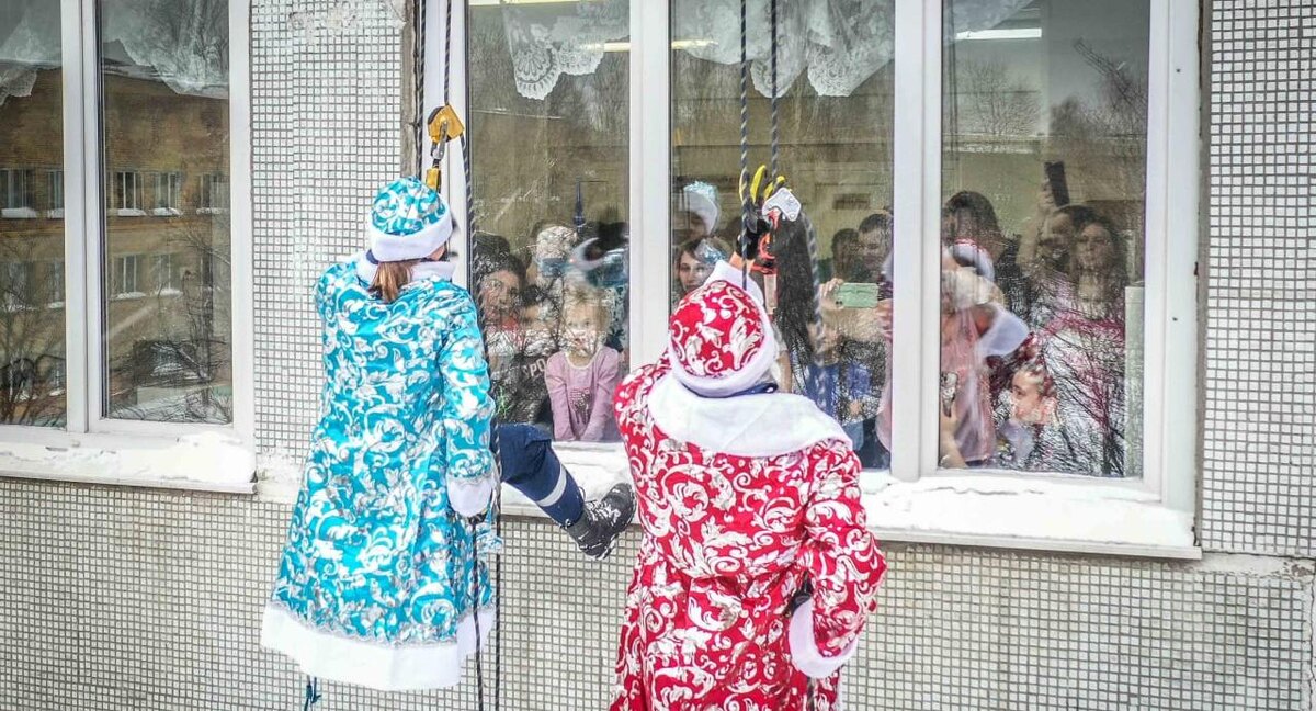 больницы. На этапе подготовки трижды проводилась проверка спусковой и страховочной систем. Праздника в стенах детской больницы ждали около тысячи ребятишек. Дедов Морозов и Снегурочек было около 50.