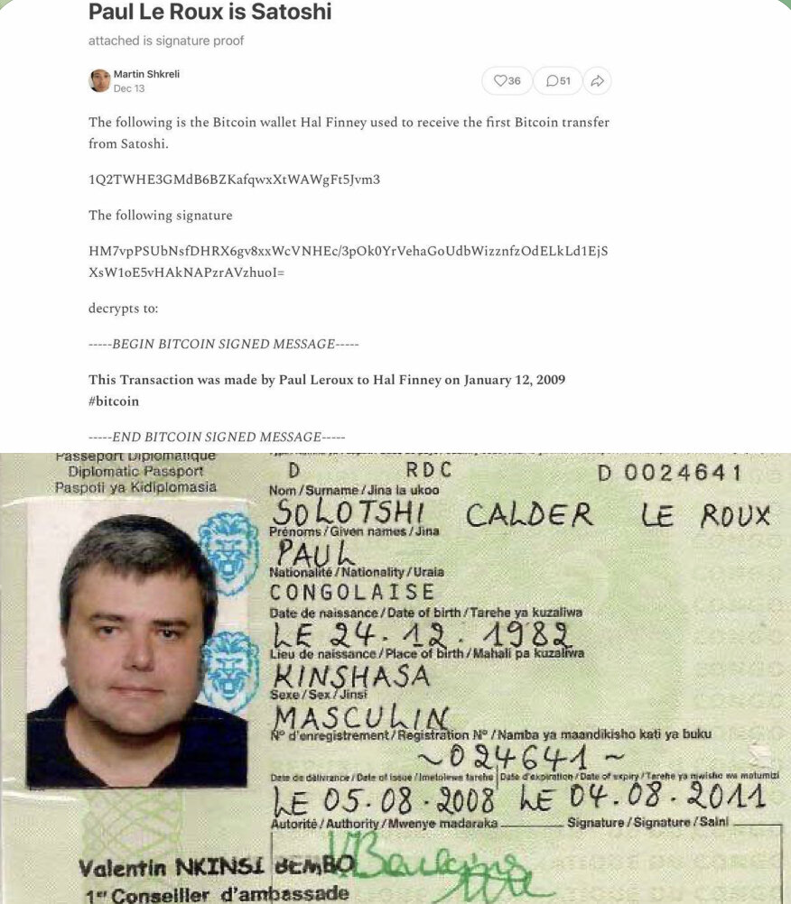 Еще один загадочный человек подписывал Биткоин адрес 2009 года, и он может оказаться Сатоши Накамото. И на это появились новые, хоть и немного косвенные, доказательства. Так, подпись одной из первых Биткоин-транзакций можно расшифровать как: «Эта транзакция была совершена Полом Ле Ру Хэлу Финни 12 января 2009." На этом основании можно сделать простой вывод, что неизвестным создателем Биткоина может оказаться некий Поль Ле Ру, - бывший босс картеля и информатор Управления по борьбе с наркотиками, а также программист, который с 2012 года вроде как находится в тюрьме под пристальным вниманием власти США. Где сейчас находится потенциальный Сатоши Накомото и жив ли он - неизвестно 🤔 А вы верите в такую версию? Больше полезной инфо в нашем канале https://t.me/kitinvest #экономика #США #инвестиции #биржа #акции #нефть #РФ #биткоин #крипта
