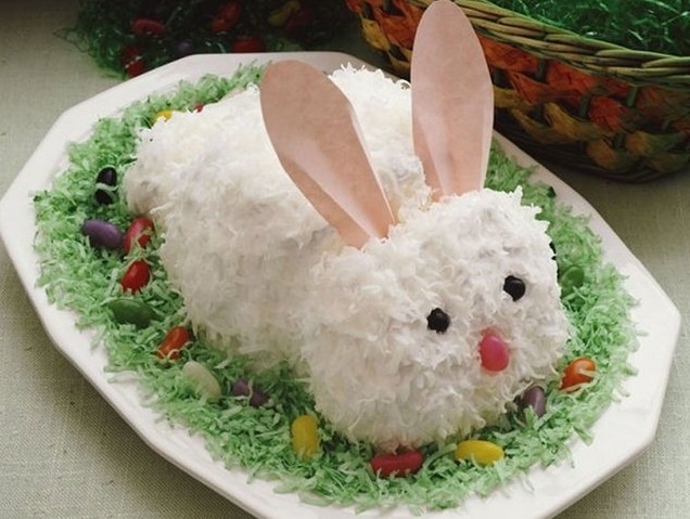1. Салат сформирован в виде целого кролика. Ушки бумажные. Глазки - маслины. Носик - ядрышко граната. 2. Салатик в форме мордочки. Ушки, носи