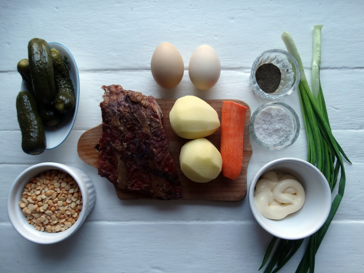 Совсем недавно узнала о салате Столичный. Приготовила, дала попробовать салат мужу. На что он: «это что? Новый вид Оливье?». Попробовала сама, и удивилась, муж прав! Салат реально очень похож на Оливье, но нежнее на вкус. Посмотрела по списку ингредиентов, и снова обнаружила огромную схожесть. Тут практически все те же ингредиенты. Правда, в рецепте, по которому я готовила, дана полная свобода в выборе горошка. Мне захотелось попробовать сделать салат с отварным горохом, и именно он дал такие нежные вкусовые нотки. Кроме того, в составе Столичного значится мясо. Обычное отварное мясо. Это я по своему выбору решила взять копченые ребрышки, рассудив, что по вкусу они идеально подходят к отварному гороху. И снова результат мне понравился. И все же, несмотря на эти отличия, в целом салат получился похожим на Оливье. Так что, всем, кому нравится этот салатик, рекомендуется попробовать и Столичный, не прогадаете. Есть в салате морковь и зеленый лук. И, как по мне, эти продукты не только дела