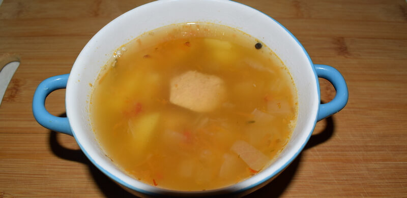 Нет, наверное, ничего проще чем приготовить картофельный суп. Сытный, вкусный и очень ароматный. Мясо на косточке, слегка разваренный картофель, лук, морковь и немного специй. Но и для его приготовления необходимо использовать ряд не хитрых правил. Порции: –+8 Ингредиенты: Мясо на косточке, в данном случае свинина, плюс немного мякоти, нарезанной с грецкий орех. Если у Вас грудинка с пленкой снимите её. Она дает неприятный привкус блюду. Наливаем в кастрюлю 4 литра холодной воды. Добавляем все мясо и ставим на огонь. Пока мясо закипает, чистим лук и морковь. Мясо закипает. Тщательно снимаем пену. Как только закипело, добавляем одну луковицу и одну морковку. И пусть себе варится на не сильном огне под неплотно закрытой крышкой около 1,5 часов. Натираем на мелкой терке морковь. Нарезаем тонкими полукольцами лук. Чистим картофель. Режем меленько и обязательно заливаем холодной водой. Мясо сварилось. Убираем из кастрюли луковичку и морковку. Они больше нам не понадобятся. Можно, кстати их