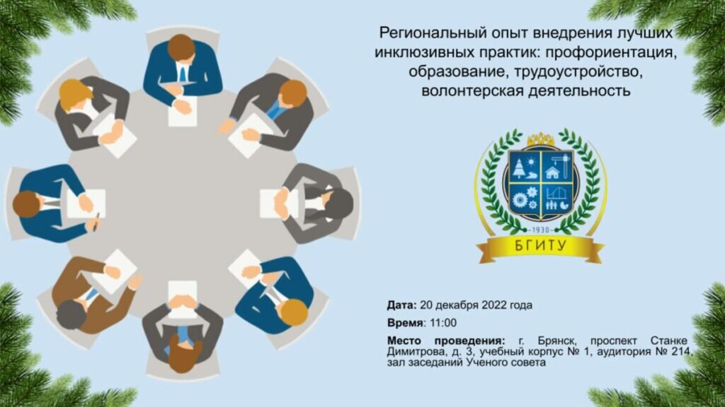 ФГБОУ ВО «Брянский государственный инженерно-технологический университет» совместно с Ресурсным учебно-методическим центром по обучению инвалидов и лиц с ограниченными возможностями здоровья ФГБОУ ВО «Российский государственный социальный университет» (г. Москва) проведет расширенный круглый стол на тему «Региональный опыт внедрения лучших инклюзивных практик: профориентация, образование, трудоустройство, волонтерская деятельность». Мероприятие состоится 20 декабря в 11 часов.