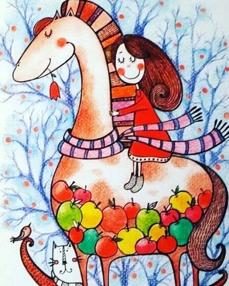У меня есть конь-коняка в красных яблоках Конёк. Я ему всегда так рада, едем в новый с ним денёк. *** Подарила шарф и цветик - для тепла и для души. Вам от нас мы шлём приветик, кот топорщит, глянь усы. *** Птичка радостно запела, в радость ей начало дня. Едем мы с конякой смело, лишь мелькают дерева. *** Мы домой вернёмся скоро, папа с мамой нас там ждут. Ты согласна, кошка Дора?! Молочка тебе нальют. *** Едем, едем мы за счастьем шарфик по ветру летит... Я в красивом, красном платье - хорошо на мне сидит. *** Картинка из инета © Copyright: Адилия Моккули, 2022 Свидетельство о публикации №122030703066 #стихи #новыйгод #яндекс.дзен #авторы.дзена #автор #зима