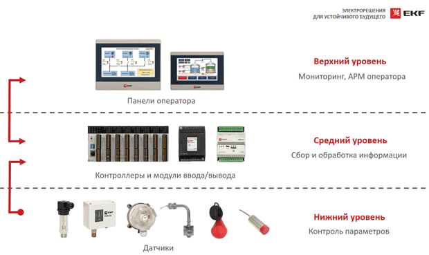 Российский производитель электротехники EKF предлагает оборудование для решения малых и средних задач автоматизации, не уступающее зарубежным аналогам, а высокий уровень технической поддержки позволяет сопровождать проекты на всех этапах. Спектр устройств EKF предназначен для трех классических уровней АСУ ТП (рис. 1): нижнего (контроль параметров), среднего (сбор параметров) и верхнего (мониторинг и диспетчерский контроль). Рассмотрим каждую группу подробно.