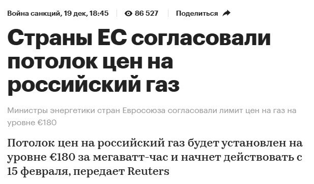 Страны Евросоюза договорились об установлении предельного лимита цен на газ, который вступит в силу с 15 февраля. Многие российские СМИ преподнесли это, как "потолок цен на российский газ", но в данном случае речь идет о газе в принципе, независимо от страны его происхождения. Я уже писал, что такая мера обсуждается: И вот, в сравнении с первоначальными предложениями по потолку в размере 275 евро за МВт*ч (или около 2974 доллара за 1000 кубометров) и желанием ряда стран снизить его до 220 евро за МВт*час, потолок был утвержден на еще более низком уровне - 180 евро за МВт*час или около 2 тыс долларов за 1000 кубометров. Это на треть ниже, чем первоначально предложенный уровень, но и на треть выше, чем текущие цены (110-120 евро за МВт*час). Данный лимит будет действовать для всех биржевых сделок с газом (здесь важно - не только с российским газом, в первую очередь, мера принята для регулирования цен на СПГ), и поначалу не будет распространяться на внебиржевые (контрактные) сделки, но в