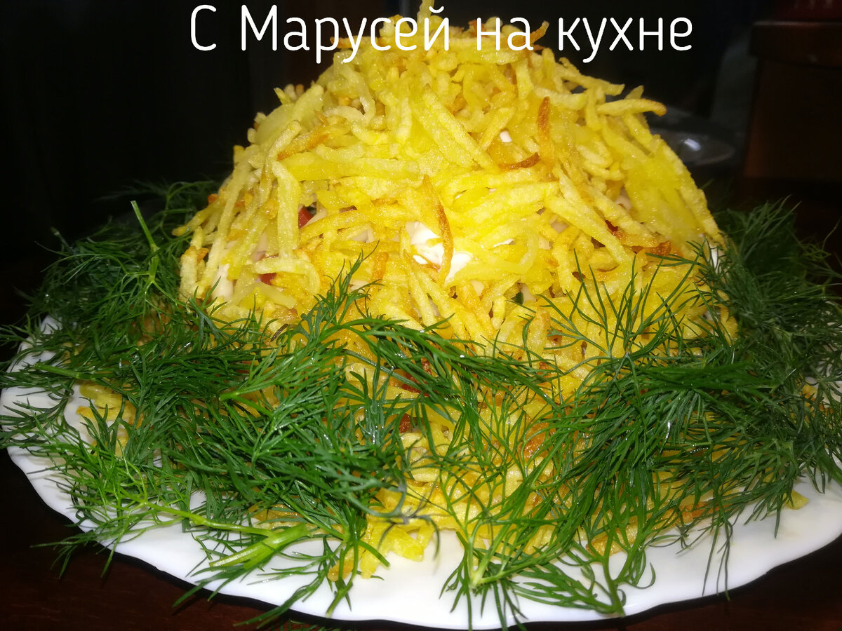 Доброе время суток дорогие Друзья!!! *** Нам понадобятся продукты : ФИЛЕ КУРИНОЕ - 250 ГРАММ ОГУРЕЦ СВЕЖИЙ - 250 ГРАММ ПОМИДОР - 250 ГРАММ КАРТОФЕЛЬ - 3 ШТУКИ (СРЕДНИХ) СЫР ТВЁРДЫЙ - 100 ГРАММ ЧЕСНОК - 2 ДОЛЬКИ СОЛЬ - ПО ВКУСУ ПЕРЕЦ ЧЁРНЫЙ МОЛОТЫЙ - ПО ВКУСУ МАЙОНЕЗ - ПО ВКУСУ ЗЕЛЕНЬ - ДЛЯ УКРАШЕНИЯ *** Курицу отвариваем и остужаем. Овощи моем и хорошо обсушиваем. Пока варится курица будем готовить картофель пай. Очищаем картошку от кожуры и натираем на тёрке для корейской морковки, затем промываем в холодной воде. Обсушиваем бумажным полотенцем и частями обжариваем в раскаленном масле. Готовый картофель выкладываем на бумажное полотенце, чтобы избавиться от лишнего масла. Остывшую курицу режем некрупно, огурцы нарезаем соломкой, чеснок и зелень измельчаем, сыр натираем на крупной тёрке. Помидоры режем соломкой и кладём в дуршлаг, чтобы избавиться от излишков жидкости. Теперь на большой плоской тарелке (блюде) начинаем собирать салат слоями. Формируем его в виде горки и каждый слой