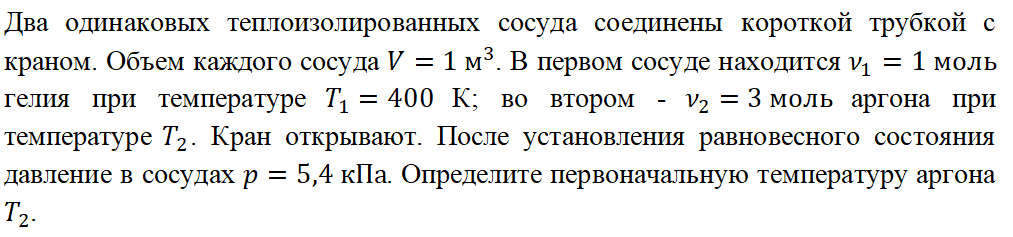 Полное условие задачи: Краткое условие задачи: Решение задачи: В указанном процессе объемы сосудов не меняются: Значит газы не совершают работу: Также система теплоизолирована: Из вышесказанного следует, что в соответствии с первым законом термодинамики суммарная внутренняя энергия газов сохраняется: Внутренняя энергия гелия равна: Внутренняя энергия аргона равна: Внутренняя энергия смеси равна: Перепишем (5) с учетом (6), (7) и (8): Запишем уравнение Менделеева-Клапейрона для конечного состояния: Выразим из (11) температуру T: Подставим (12) в (9): Выразим из (16) температуру аргона: Подставляем данные и находим численный ответ: Ответ: 300 К.