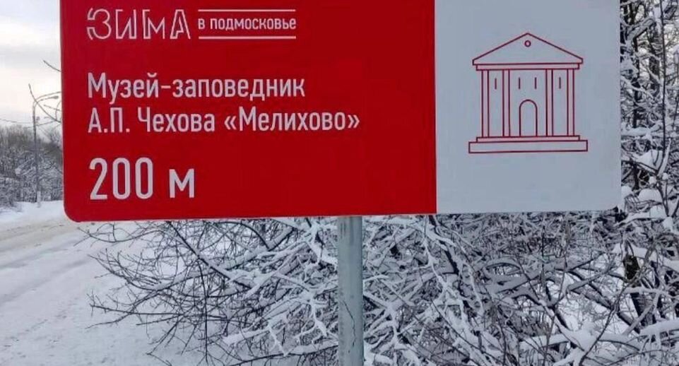 Под единым брендом на региональных дорогах установили порядка 100 информационных знаков, сообщили в министерстве транспорта и дорожной инфраструктуры региона. Они появились в рамках проекта «Зима в Подмосковье» вблизи туристических мест в 27 городских округах, чтобы обратить внимание гостей региона на самые интересные площадки для зимнего отдыха. Яркий информационный знак установили за 200 метров до музея заповедника А. П. Чехова «Мелихово». О запуске масштабного брендированного проекта «Зима в Подмосковье» объявил губернатор Московской области Андрей Воробьев в конце ноября 2018.
