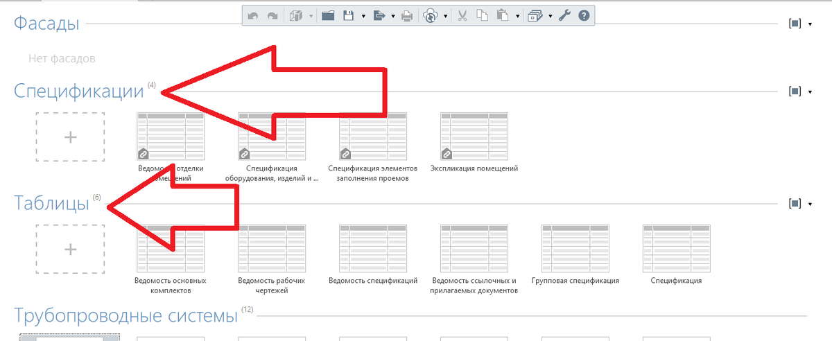 Если в ренга щелкнуть значок плюса (+) "Обозреватель проекта" и в открывшемся окне пролистать вниз, то увидите блоки "Спецификации" и "Таблицы".