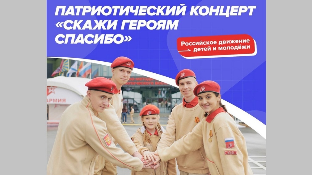 Сегодня, 20 декабря, пройдёт концерт-видеооткрытка «Скажи героям спасибо!» в Центральном академическом театре Российской Армии. На сцене выступят юнармейские творческие коллективы и известные артисты: группа «Любэ», Олег Газманов, Сергей Войтенко, Академический дважды Краснознамённый, ордена Красной Звезды ансамбль песни и пляски Российской армии имени А. В. Александрова.