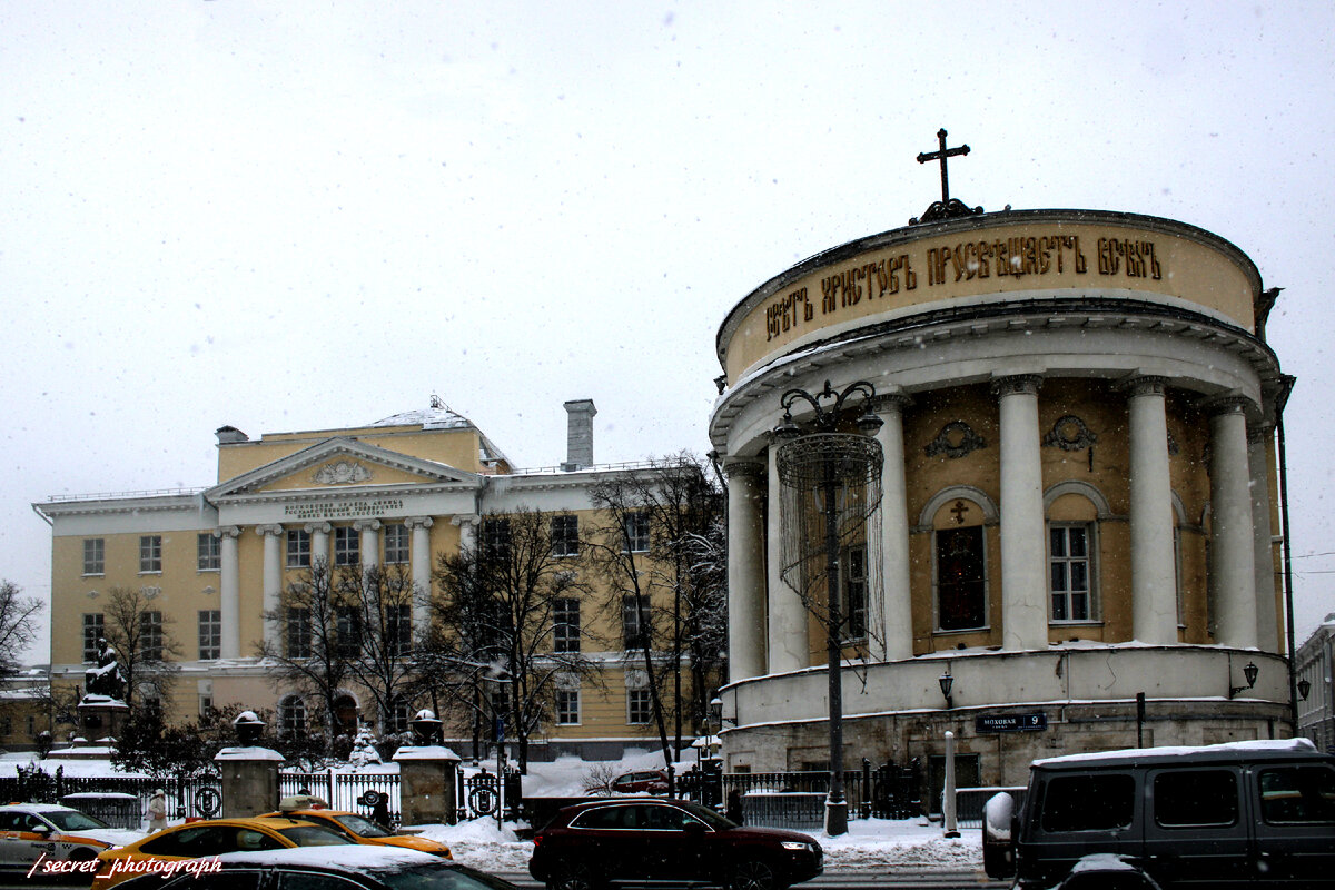 Вот например, здание МГУ напротив Манежа. Всегда обращал внимание на выступающую к самой дороге полукруглую башенку-флигель с крестом и надписью «Свѣтъ Хрiстовъ просвѣщаетъ всѣхъ». Всегда был уверен, что это просто крыло Университета и ничего более. Несколько раз фотографировал, но, насколько помню, ни разу даже нигде эти фото потом не постил. Но тут вдруг заинтересовался.