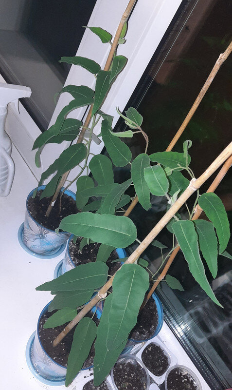 Вчера наконец-то по-новому подвязала эвкалипты. Они уже большие, самый высокий 40 см, но стволы еще тоненькие. сами себя держат, но еще не прямо. то есть не ложатся на землю, но и прямо не стоят. длины каминных спичек уже не хватает, чтобы поддерживать их целиком. Уруру купил (не знаю даже где, наверное, в Леруа) бамбуковые палочки, у них длина вроде 60 см. Купил еще 3 дня назад, и вот вчера я, наконец, поменяла спички на бамбук. очень боялась повредить корешки, надеюсь, не задела их. и рискнула у одного отрезать верхушку, посмотрим как будет отращивать новые веточки. а то нижние листочки мы всё еще сбрасываем, но поменьше. но новые так и не растут. посмотрим, поможет ли обрезка. Теперь мои прелести выглядят так: