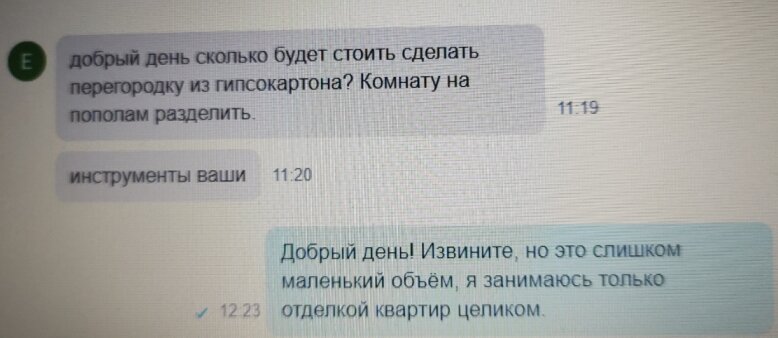 Всем привет! Вот не было у меня никакого желания вновь поднимать вопрос об уровне нынешних ремонтников. Потому что, на моём канале много уже про это сказано и обсуждено. Но те вопросы , что я выносил на обсуждение были исключительно взглядом с моей стороны, то есть изнутри этой "каши", я имею ввиду рынок услуг по ремонту квартир. Но! Сегодня, я узнал мнение непосредственно другой стороны-заказчиков, выраженной "за глаза" настоящей так сказать. Узнал и слегка ошалел и не только я , а все кто были на поднадзорном объекте, а занимаюсь я строительным надзором. А теперь к сути: очередной день из трудобудней стройнадзора, обсуждаем с парнями производимые работы, всё как обычно и вдруг одному из них приходит (бригадиру) сообщение на планшет, после которого в течении пары минут из его уст раздавались исключительно непечатные выражения. Вам интересно, уважаемые читатели, что его ввергло в пучину идиоматических выражений? Смотрите: это было сообщение, которое пишут в одноим известном сервисе