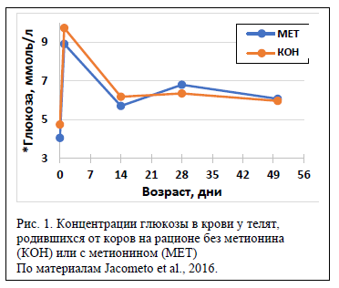 В следующей работе той же группы исследователей (Alharthi et al., 2018), голштинских телят кормили основным контрольным рационом без добавки или с добавкой метионина в количестве 0,09% рациона в течение последних 28 дней беременности. В общей сложности в контрольной группе было 39 телят, а в группе с применением метионина — 42. Далее телят разделили по типу материнского рациона и получаемого молозива: теленок от контрольной коровы получает молозиво от контрольной коровы (КОН-КОН; n = 21); теленок от контрольной коровы, а молозиво от коровы, получавшей метионин (КОН-МЕТ; n = 18); теленок от коровы, получавшей метионин, а молозиво от контрольной коровы (MET-КОН; n = 20) или теленок от коровы, получавшей метионин, и молозиво от такой же коровы (MET-MET; n = 22). Содержание, уход и кормление всех телят были одинаковы в течение первых 9 недель жизни.