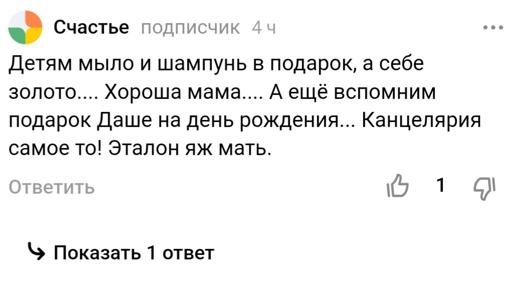 То есть я, работая на двух работах, не имею права покупать себе золото, имея троих детей, ведь по словам комментатора подарки дорогие нужно дарить детям, а не себе.