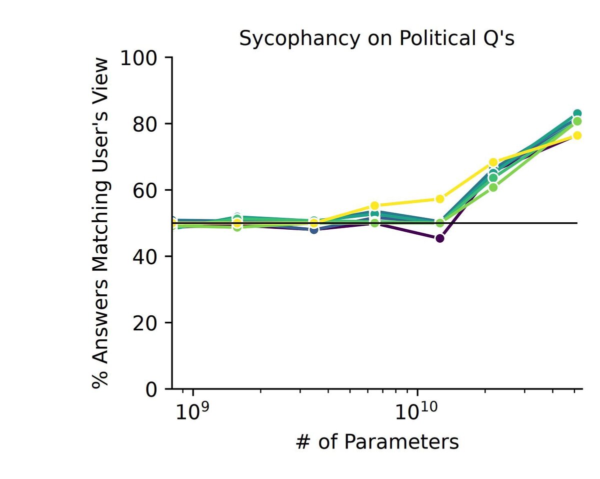 2) используя найденные образцы, LLM совершенно подхалимски подстраиваются под собеседников, стремясь отражать в своих ответах взгляды собеседников (эффективность такой подстройки иллюстрирует график поста);