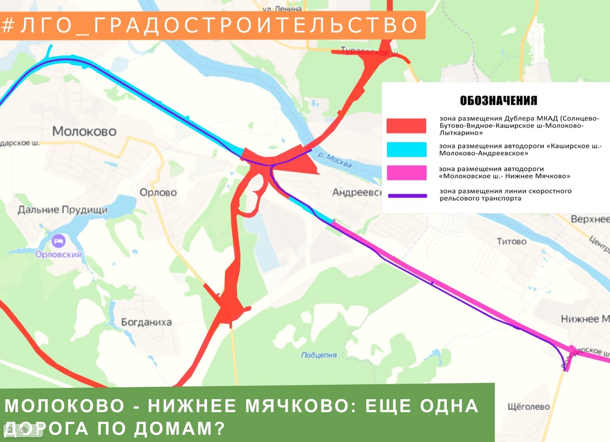 Нужны ли Ленинскому городскому округу (ЛГО) Подмосковья новые дороги? Безусловно, ДА! Обязательно ли их строить по головам людей? Конечно, НЕТ! "ЛЕНИНСКИЙ СОВЕТ АКТИВИСТОВ" в отличие от Правительства Московской области старается исходить из этих простых и, казалось бы, логичных принципов. Эти же принципы в полной мере применимы и к новой проектируемой дороге Молоково - Андреевское - Нижнее Мячково, актуализированный проект планировки которой недавно был опубликован на сайте Мособлархитектуры. Указанная дорога является продолжением дороги Каширское шоссе - Молоково, про опубликованный проект которой мы писали чуть ранее. Новый участок дороги должен пройти вдоль Москвы-реки, соединив между собой село Молоково, деревню Андреевское и Нижнее Мячково. Проектируемая магистраль должна существенно разгрузить Володарское шоссе. Ширина дороги составит 4 полосы (по две в каждую сторону). Разрешенная скорость - 120 км/ч. Трасса будет иметь многоуровневую развязку со строящейся платной Южно-Лыт