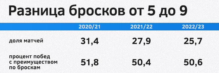 Подведем итог, соединив три последние категории в одну. Получается, что в целом с преимуществом в 10+ бросков команды сейчас побеждают примерно в половине случаев. Хотя до этого было пусть не самое большое, но заметное преимущество – 6 побед на 10 игр.