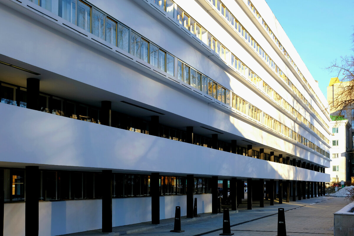Сегодня в рубрике "Дома Москвы" поговорим про прекрасный образец конструктивизма и посмотрим чем хорош Дом Наркомфина. Расположение - Новинский бульвар, 25 корпус 1 Архитекторы - Моисей Гинзбург, Игнатий Милинис Даты постройки - 1928 -1930 гг Чем уникален Дом Наркомфина? Это был первый в стране жилой дом из железобетона. Дом стоит на ножках, что было инновационным для того времени. После строительства здание стали называть дом-корабль. Функцию несущих конструкций здания выполняют не внешние стены, а колонны, на которых и висит весь каркас дома. Квартиры в доме Наркомфина располагаются на двух ярусах, при этом основное помещение гостиной имеет высокий потолок (до 7 м), а на втором ярусе может располагаться, например, спальня, куда человек приходит отдохнуть и где высоких потолков и огромных просторов не требуется. Дом практически чётко ориентирован по сторонам света, что также учитывается в планировках: окна спален выходят на восток, откуда встаёт солнце и с утра наполняет комнату све